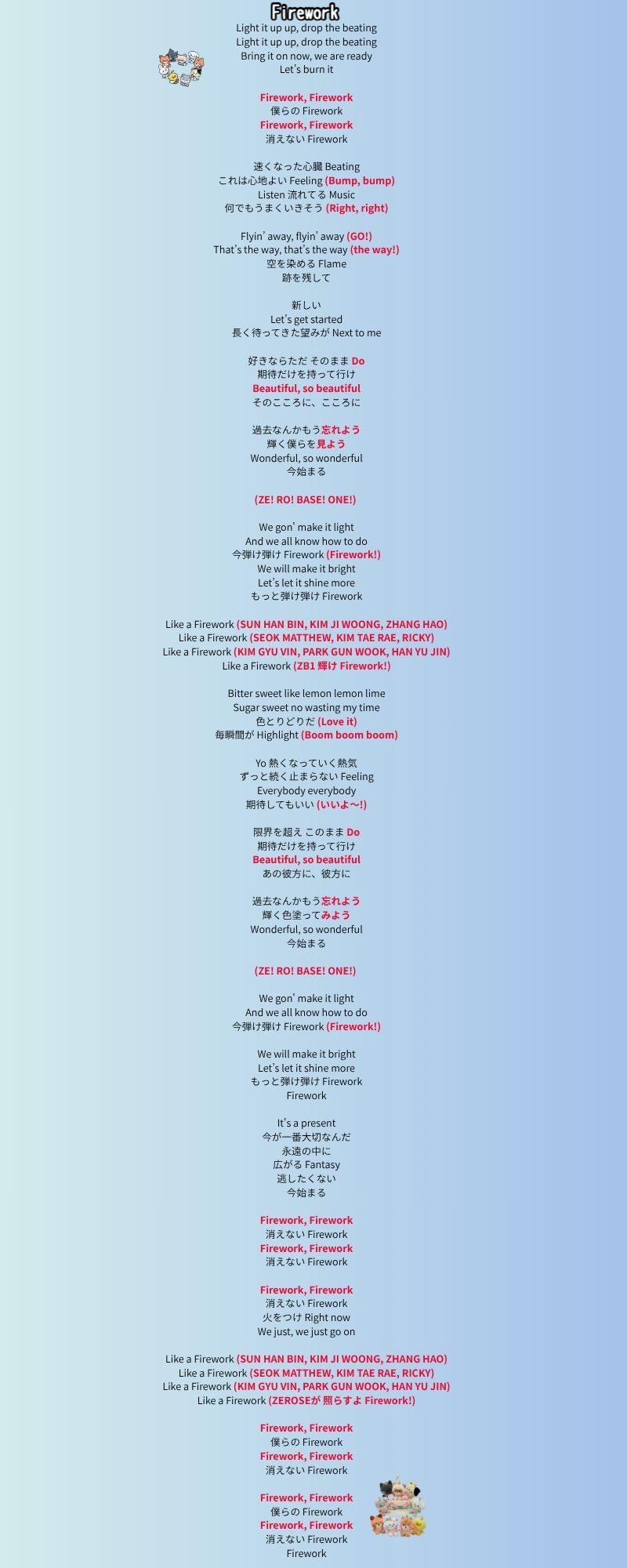Fireworkの動画は公式からも出ていないので、ゼロズさんが作ってくれたパート分けの動画を貼っておきます!